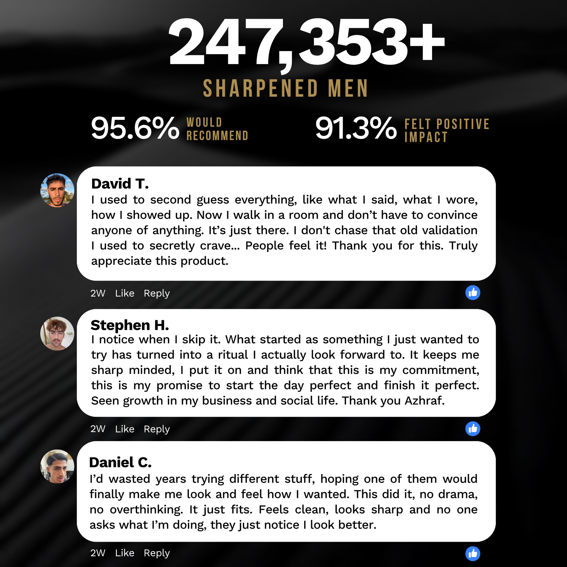 "I hesitated for weeks before trying it. Thought people would notice or say something. Turns out, no one could tell, they just said I looked better or more focused. Now it’s a daily ritual! Not for attention but as a self promise. Makes me feel ALIVE!"